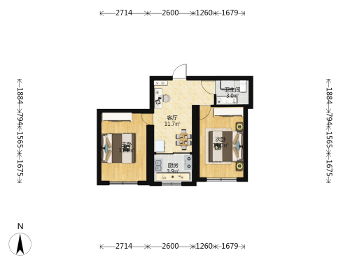 房屋戶型: 2 室1廳 1 廚1衛(wèi)